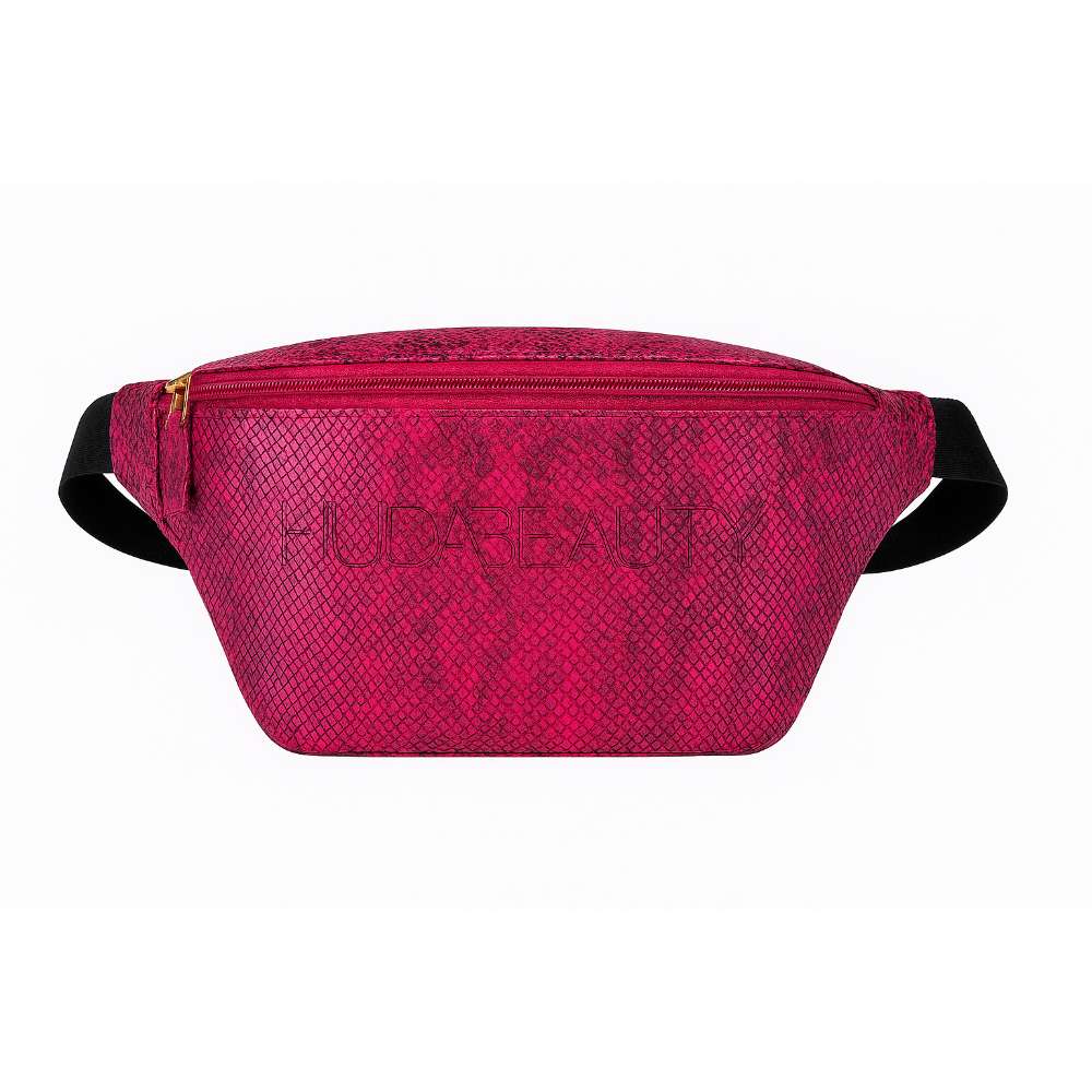 A pink statement belt bag featuring Huda Beauty branding, crafted with a glossy, wipe-clean finish and secure metal hardware—perfect for those who love hands-free fashion with major impact.
