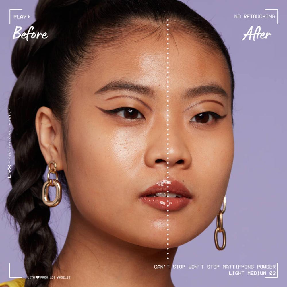 Achieve an all-day matte finish with the NYX Can’t Stop Won’t Stop Mattifying Pressed Powder — a lightweight, non-drying formula infused with oil-absorbing rice powder to smooth the complexion, control shine, and keep makeup locked in place. Available in sheer, true-to-skin shades, it delivers a smooth, natural look without ashiness, cakiness, or transfer.
