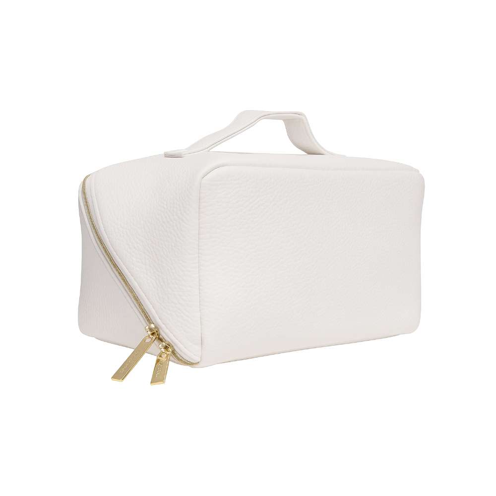 Featuring dual gold-tone zippers and a structured top handle, this spacious bag opens completely flat to reveal a smart, organized interior—perfect for makeup artists and beauty lovers alike. Its wipeable inner lining and multiple compartments make it easy to store and access brushes, palettes, and other essentials on the go.