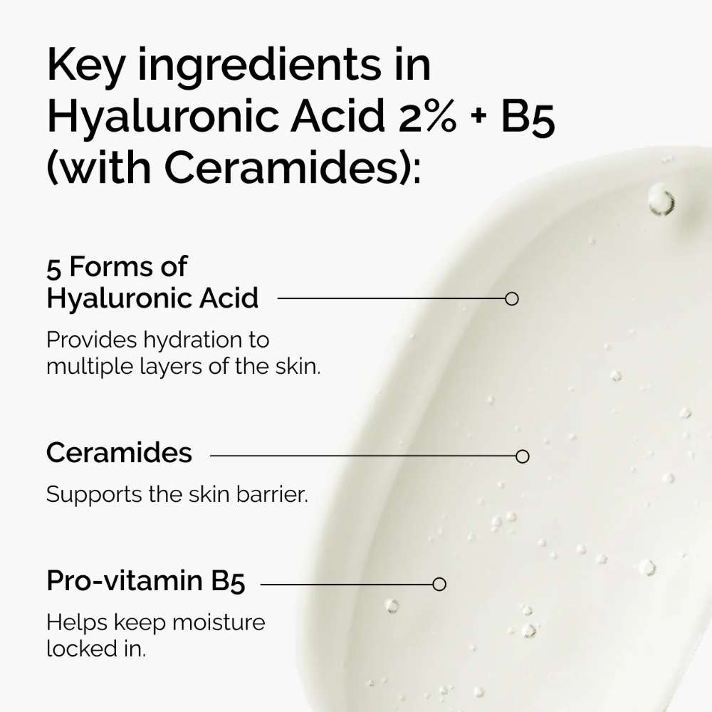 - Hyaluronic Acid 2% + B5 Serum: Deeply hydrates and helps support a healthy moisture barrier for soft, plump skin