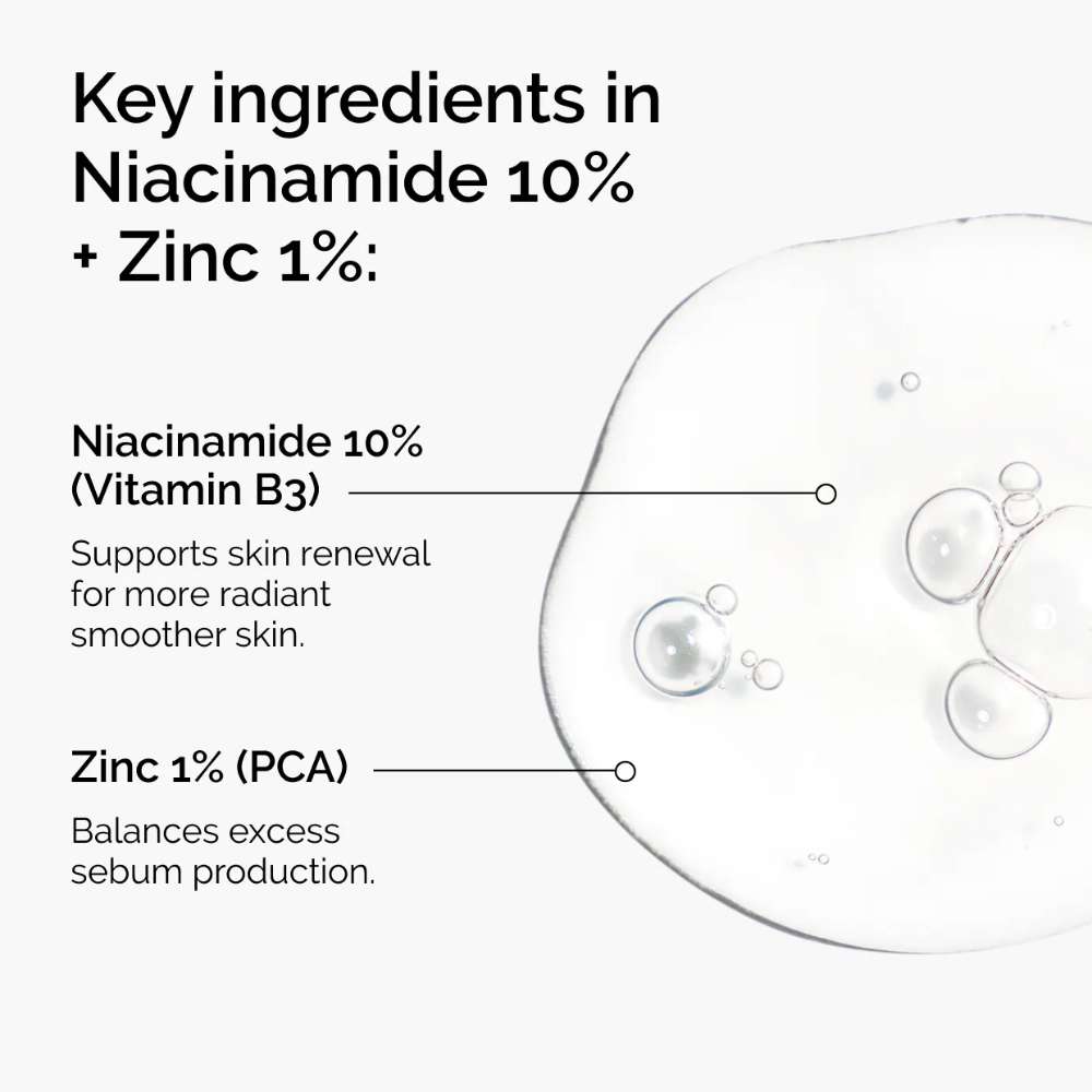 - Niacinamide 10% + Zinc 1% Serum: Visibly reduces the look of blemishes, regulates oil, and minimizes the appearance of pores